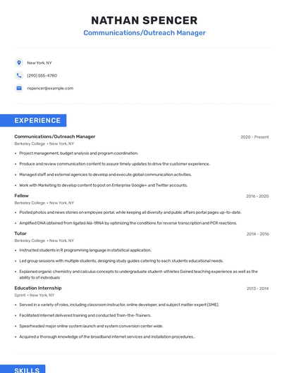 Build a professional communications/outreach manager resume in minutes. Browse through our resume examples to identify the best way to word your resume. Then choose from 5+ resume templates to create your communications/outreach manager resume.