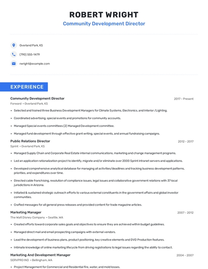 Build a professional community development director resume in minutes. Browse through our resume examples to identify the best way to word your resume. Then choose from 5+ resume templates to create your community development director resume.
