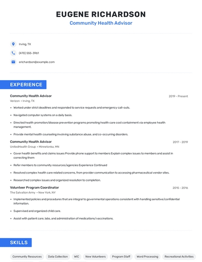 Build a professional community health advisor resume in minutes. Our AI resume writing assistant will guide you through every step of the process, and you can choose from 10+ resume templates to create your community health advisor resume.7. Ministry