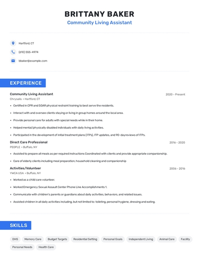 Build a professional community living assistant resume in minutes. Browse through our resume examples to identify the best way to word your resume. Then choose from 5+ resume templates to create your community living assistant resume.
