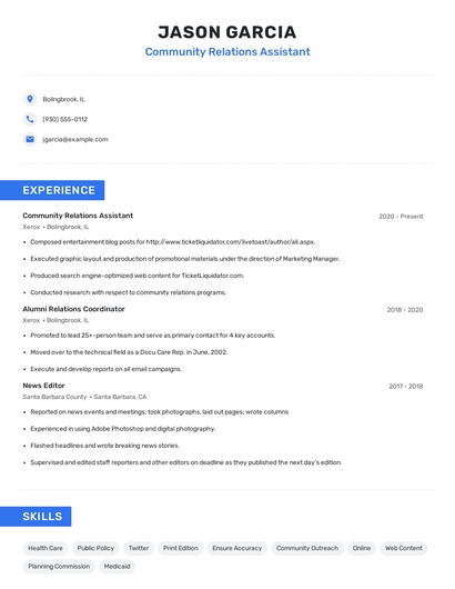 Build a professional community relations assistant resume in minutes. Our AI resume writing assistant will guide you through every step of the process, and you can choose from 10+ resume templates to create your community relations assistant resume.7. Website Content
