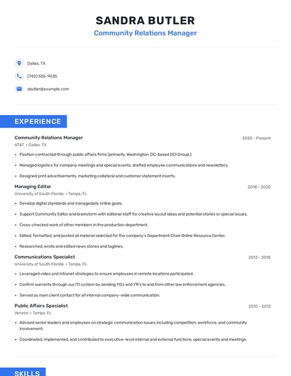 Build a professional community relations manager resume in minutes. Browse through our resume examples to identify the best way to word your resume. Then choose from 5+ resume templates to create your community relations manager resume.