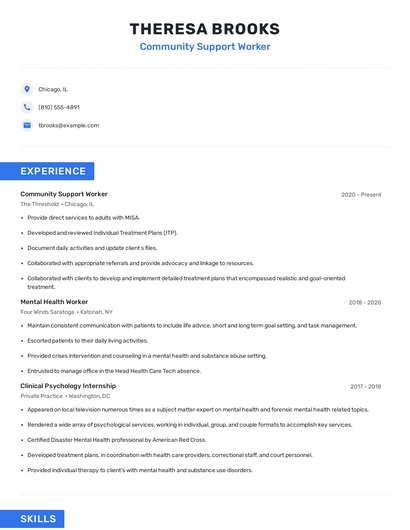 Build a professional community support worker resume in minutes. Our AI resume writing assistant will guide you through every step of the process, and you can choose from 10+ resume templates to create your community support worker resume.7. Severe Mental Illness
