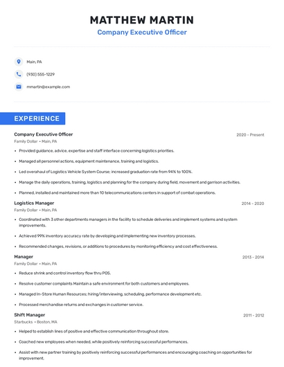 Build a professional company executive officer resume in minutes. Browse through our resume examples to identify the best way to word your resume. Then choose from 5+ resume templates to create your company executive officer resume.
