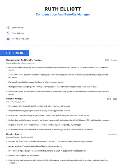 Build a professional compensation and benefits manager resume in minutes. Browse through our resume examples to identify the best way to word your resume. Then choose from 5+ resume templates to create your compensation and benefits manager resume.