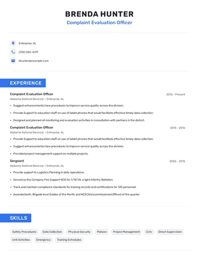 Build a professional complaint evaluation officer resume in minutes. Browse through our resume examples to identify the best way to word your resume. Then choose from 5+ resume templates to create your complaint evaluation officer resume.