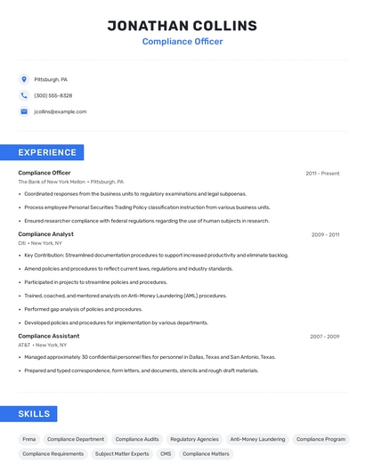 Build a professional compliance officer resume in minutes. Our AI resume writing assistant will guide you through every step of the process, and you can choose from 10+ resume templates to create your compliance officer resume.7. Regulatory Compliance