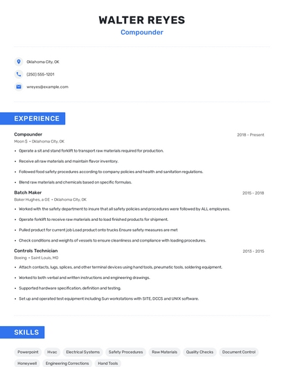 Build a professional compounder resume in minutes. Browse through our resume examples to identify the best way to word your resume. Then choose from 5+ resume templates to create your compounder resume.