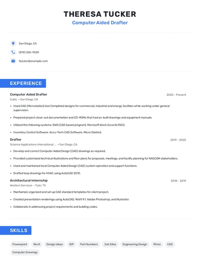 Build a professional computer aided drafter resume in minutes. Browse through our resume examples to identify the best way to word your resume. Then choose from 5+ resume templates to create your computer aided drafter resume.