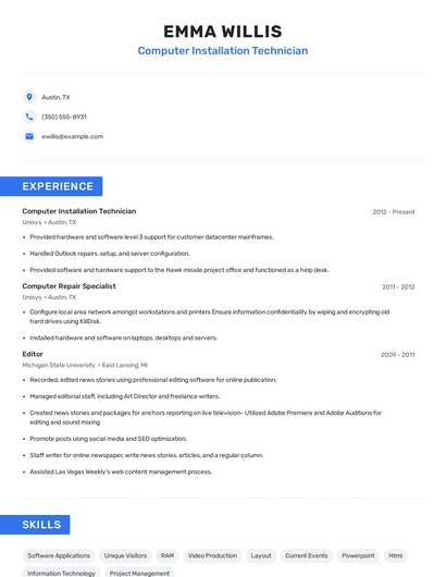 Build a professional computer installation technician resume in minutes. Browse through our resume examples to identify the best way to word your resume. Then choose from 5+ resume templates to create your computer installation technician resume.