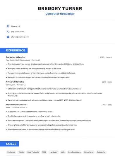 Build a professional computer networker resume in minutes. Browse through our resume examples to identify the best way to word your resume. Then choose from 5+ resume templates to create your computer networker resume.