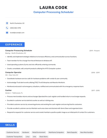 Build a professional computer processing scheduler resume in minutes. Our AI resume writing assistant will guide you through every step of the process, and you can choose from 10+ resume templates to create your computer processing scheduler resume.7. Troubleshoot