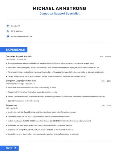 Build a professional computer support specialist resume in minutes. Browse through our resume examples to identify the best way to word your resume. Then choose from 5+ resume templates to create your computer support specialist resume.