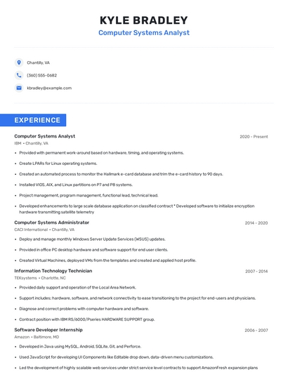 Build a professional computer systems analyst resume in minutes. Browse through our resume examples to identify the best way to word your resume. Then choose from 5+ resume templates to create your computer systems analyst resume.