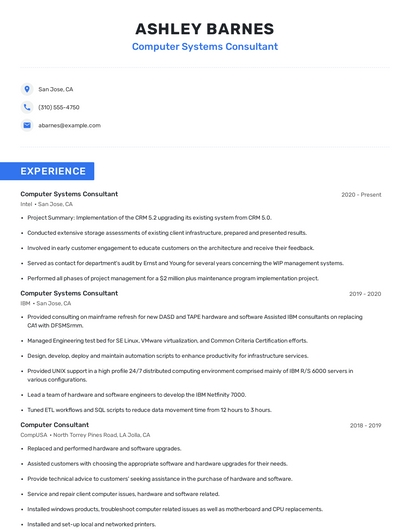 Build a professional computer systems consultant resume in minutes. Browse through our resume examples to identify the best way to word your resume. Then choose from 5+ resume templates to create your computer systems consultant resume.