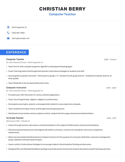 Build a professional computer teacher resume in minutes. Browse through our resume examples to identify the best way to word your resume. Then choose from 5+ resume templates to create your computer teacher resume.