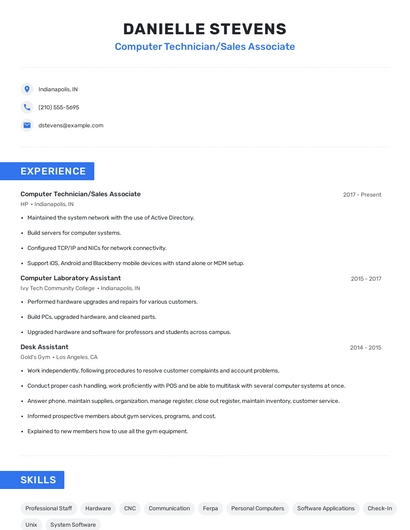 Build a professional computer technician/sales associate resume in minutes. Browse through our resume examples to identify the best way to word your resume. Then choose from 5+ resume templates to create your computer technician/sales associate resume.