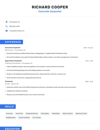 Build a professional concrete carpenter resume in minutes. Browse through our resume examples to identify the best way to word your resume. Then choose from 5+ resume templates to create your concrete carpenter resume.