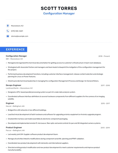 Build a professional configuration manager resume in minutes. Browse through our resume examples to identify the best way to word your resume. Then choose from 5+ resume templates to create your configuration manager resume.