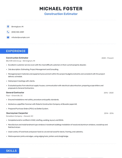 Build a professional construction estimator resume in minutes. Browse through our resume examples to identify the best way to word your resume. Then choose from 5+ resume templates to create your construction estimator resume.