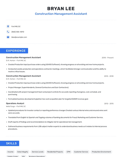 Build a professional construction management assistant resume in minutes. Browse through our resume examples to identify the best way to word your resume. Then choose from 5+ resume templates to create your construction management assistant resume.