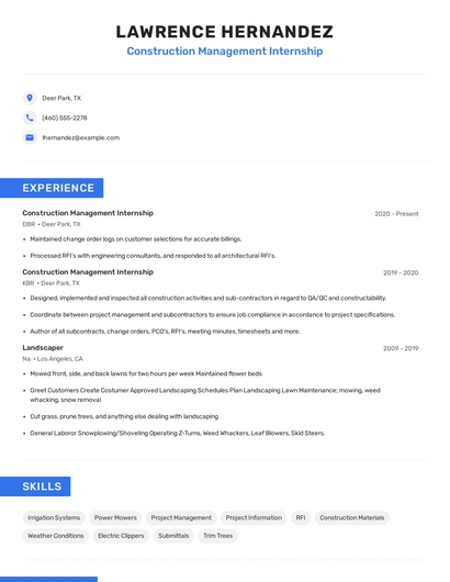 Build a professional construction management internship resume in minutes. Browse through our resume examples to identify the best way to word your resume. Then choose from 5+ resume templates to create your construction management internship resume.