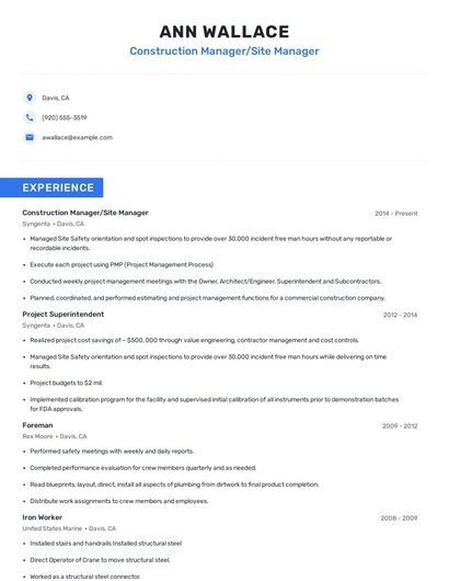 Build a professional construction manager/site manager resume in minutes. Browse through our resume examples to identify the best way to word your resume. Then choose from 5+ resume templates to create your construction manager/site manager resume.