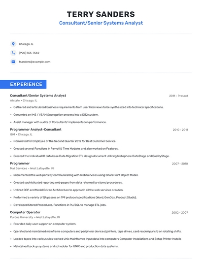 Build a professional consultant/senior systems analyst resume in minutes. Browse through our resume examples to identify the best way to word your resume. Then choose from 5+ resume templates to create your consultant/senior systems analyst resume.