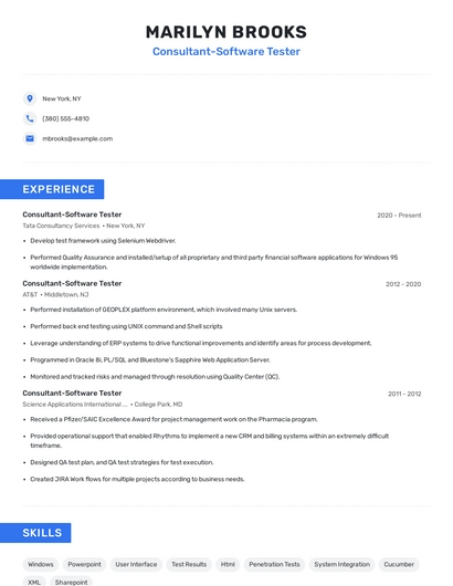 Build a professional consultant-software tester resume in minutes. Browse through our resume examples to identify the best way to word your resume. Then choose from 5+ resume templates to create your consultant-software tester resume.