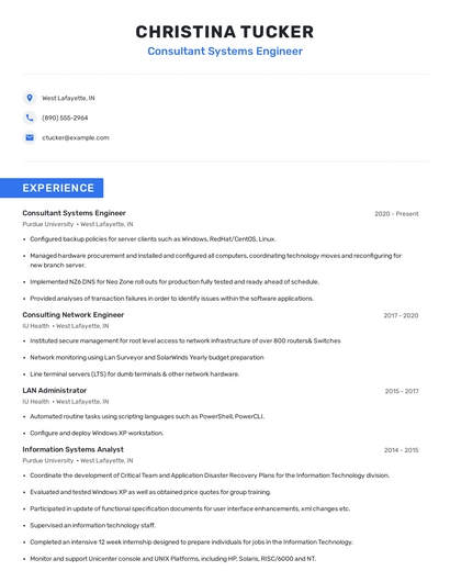 Build a professional consultant systems engineer resume in minutes. Browse through our resume examples to identify the best way to word your resume. Then choose from 5+ resume templates to create your consultant systems engineer resume.