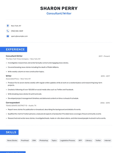 Build a professional consultant/writer resume in minutes. Browse through our resume examples to identify the best way to word your resume. Then choose from 5+ resume templates to create your consultant/writer resume.