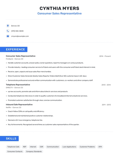 Build a professional consumer sales representative resume in minutes. Browse through our resume examples to identify the best way to word your resume. Then choose from 5+ resume templates to create your consumer sales representative resume.