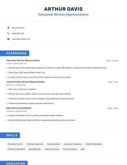 Build a professional consumer service representative resume in minutes. Browse through our resume examples to identify the best way to word your resume. Then choose from 5+ resume templates to create your consumer service representative resume.