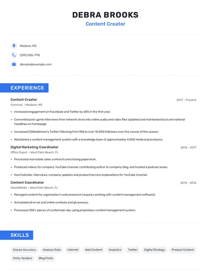 Build a professional content creator resume in minutes. Browse through our resume examples to identify the best way to word your resume. Then choose from 5+ resume templates to create your content creator resume.
