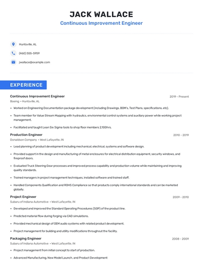 Build a professional continuous improvement engineer resume in minutes. Browse through our resume examples to identify the best way to word your resume. Then choose from 5+ resume templates to create your continuous improvement engineer resume.