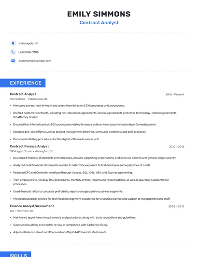 Build a professional contract analyst resume in minutes. Browse through our resume examples to identify the best way to word your resume. Then choose from 5+ resume templates to create your contract analyst resume.