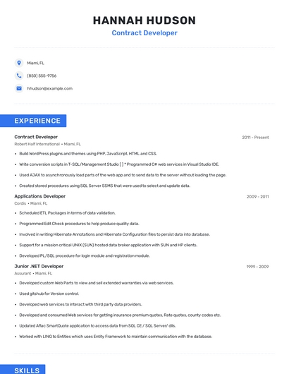 Build a professional contract developer resume in minutes. Browse through our resume examples to identify the best way to word your resume. Then choose from 5+ resume templates to create your contract developer resume.