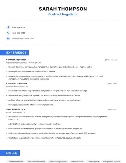 Build a professional contract negotiator resume in minutes. Browse through our resume examples to identify the best way to word your resume. Then choose from 5+ resume templates to create your contract negotiator resume.