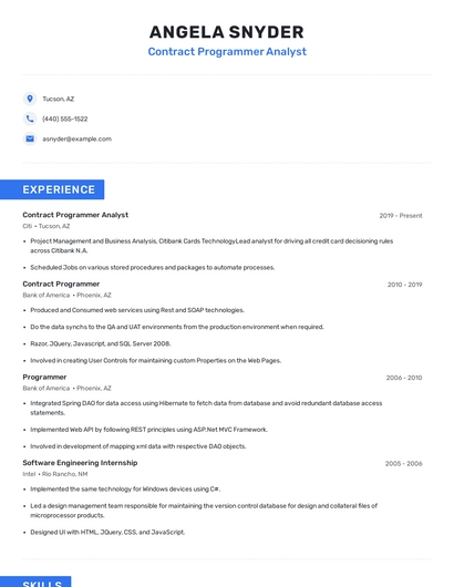 Build a professional contract programmer analyst resume in minutes. Browse through our resume examples to identify the best way to word your resume. Then choose from 5+ resume templates to create your contract programmer analyst resume.