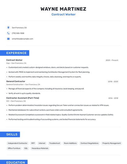 Build a professional contract worker resume in minutes. Our AI resume writing assistant will guide you through every step of the process, and you can choose from 10+ resume templates to create your contract worker resume.7. HR