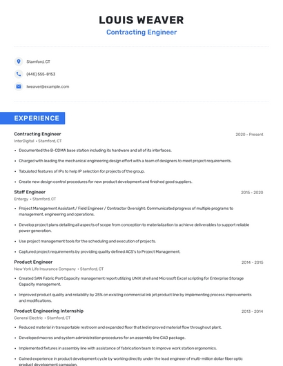 Build a professional contracting engineer resume in minutes. Browse through our resume examples to identify the best way to word your resume. Then choose from 5+ resume templates to create your contracting engineer resume.