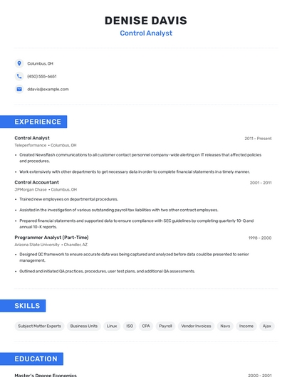 Build a professional control analyst resume in minutes. Browse through our resume examples to identify the best way to word your resume. Then choose from 5+ resume templates to create your control analyst resume.