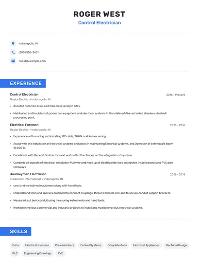 Build a professional control electrician resume in minutes. Browse through our resume examples to identify the best way to word your resume. Then choose from 5+ resume templates to create your control electrician resume.