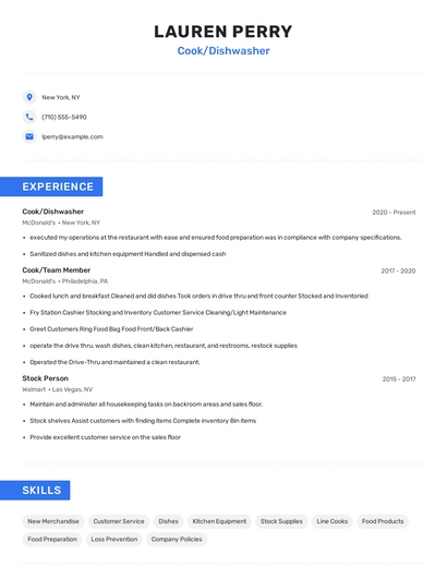 Build a professional cook/dishwasher resume in minutes. Browse through our resume examples to identify the best way to word your resume. Then choose from 5+ resume templates to create your cook/dishwasher resume.