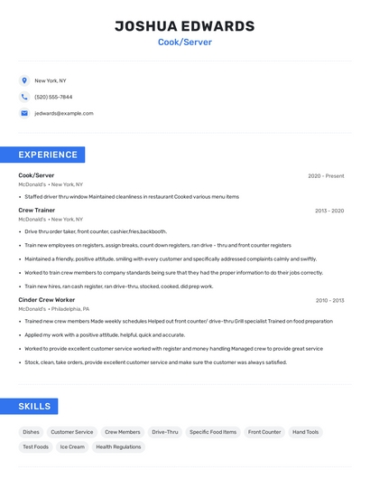 Build a professional cook/server resume in minutes. Browse through our resume examples to identify the best way to word your resume. Then choose from 5+ resume templates to create your cook/server resume.