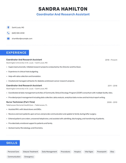 Build a professional coordinator and research assistant resume in minutes. Browse through our resume examples to identify the best way to word your resume. Then choose from 5+ resume templates to create your coordinator and research assistant resume.