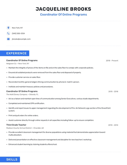 Build a professional coordinator of online programs resume in minutes. Browse through our resume examples to identify the best way to word your resume. Then choose from 5+ resume templates to create your coordinator of online programs resume.
