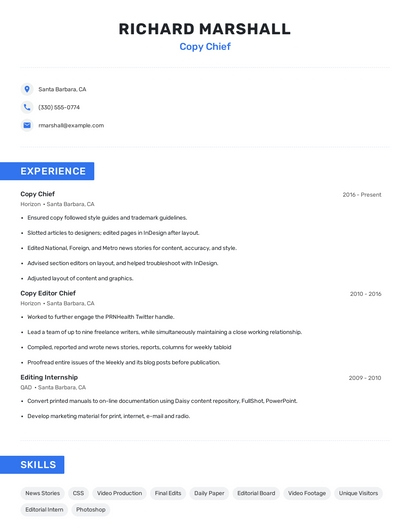 Build a professional copy chief resume in minutes. Browse through our resume examples to identify the best way to word your resume. Then choose from 5+ resume templates to create your copy chief resume.