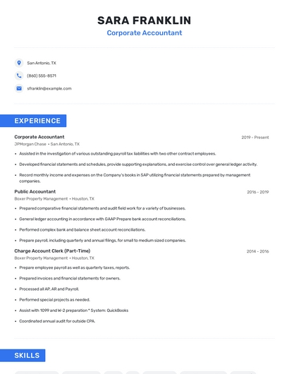 Build a professional corporate accountant resume in minutes. Browse through our resume examples to identify the best way to word your resume. Then choose from 5+ resume templates to create your corporate accountant resume.