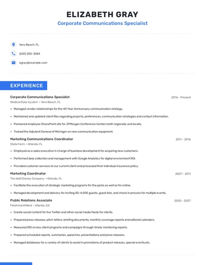 Build a professional corporate communications specialist resume in minutes. Our AI resume writing assistant will guide you through every step of the process, and you can choose from 10+ resume templates to create your corporate communications specialist resume.7. Communications Support